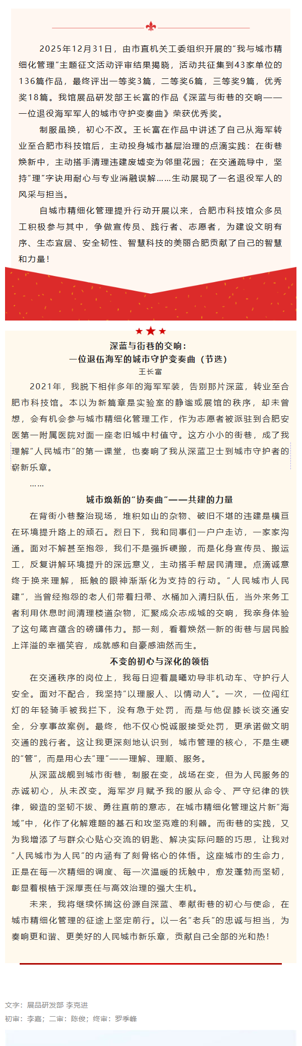 喜报!科技馆员工在“我与城市精细化管理”主题征文中获佳绩